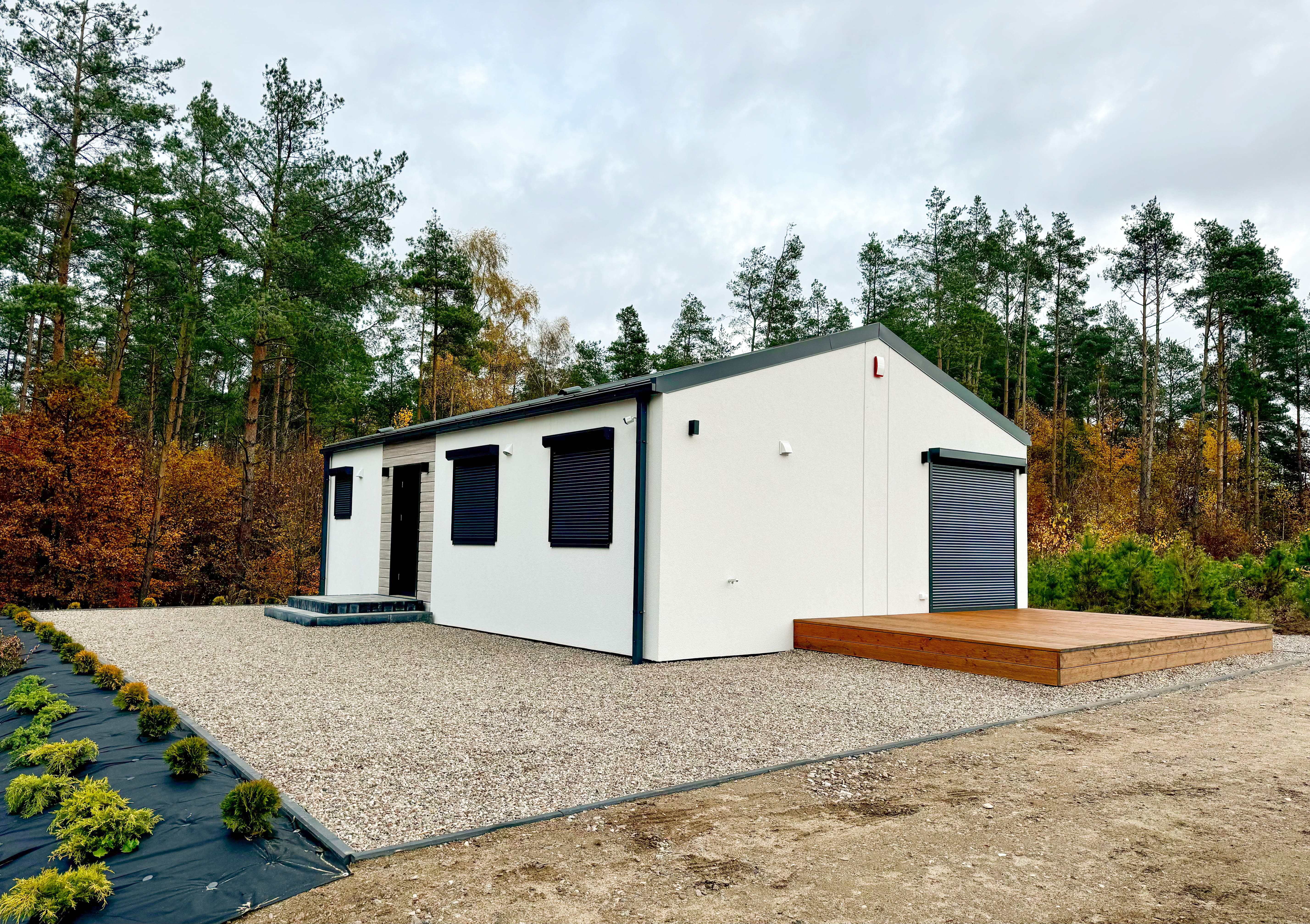Dwumodułowy Model S powstał tuż przy ścianie lasu. Przemyślany układ pomieszczeń zapewnia codzienny komfort, a przestronny taras staje się naturalnym przedłużeniem domu, idealnym do porannej kawy czy wieczornego relaksu. Funkcjonalność całej przestrzeni łączy praktyczność, wygodę i estetykę, pozwalając cieszyć się bliskością przyrody na co dzień.